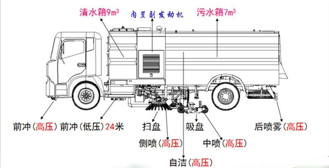 ● 德國高壓水泵(前沖/側噴/中噴/后噴霧(不銹鋼噴嘴)/側沖洗/18米高壓卷盤水槍/垃圾箱自潔裝置),清洗能力強;萬向高壓路沿清洗,威龍低壓泵(前沖);不銹鋼高壓管路;德國控制器;日本控件開關;美國傳感器;