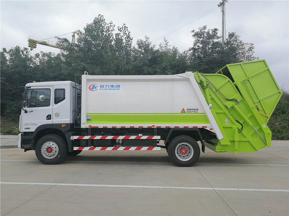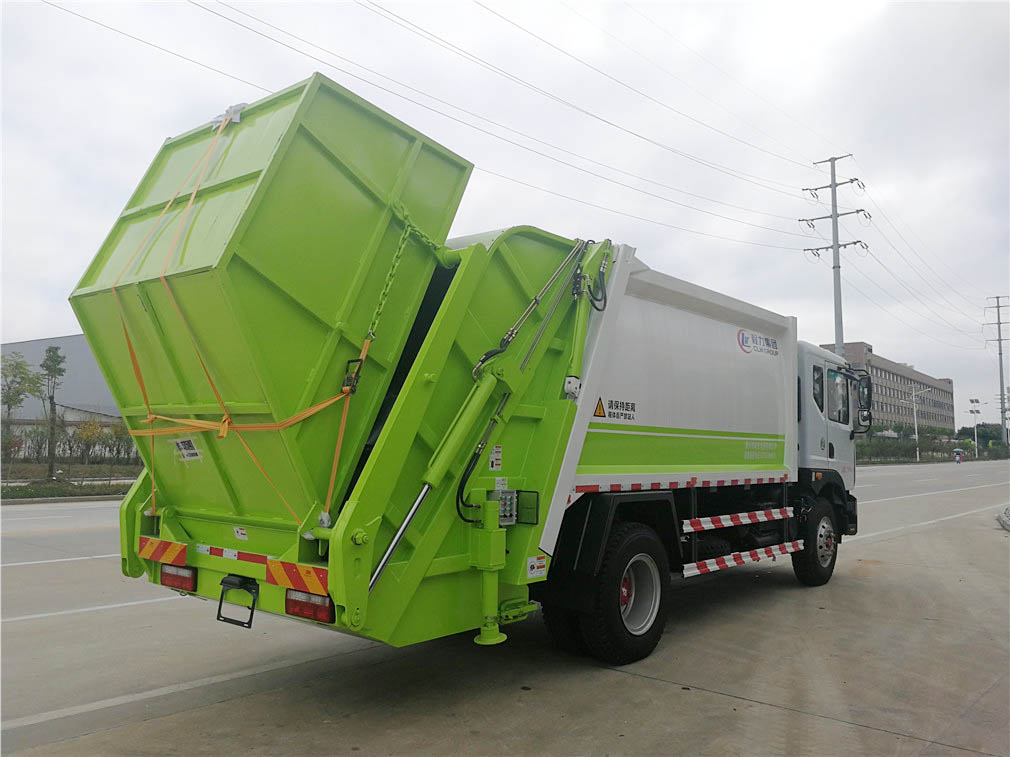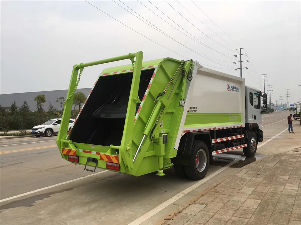 東風(fēng)D9壓縮垃圾車上裝箱體是用優(yōu)質(zhì)碳鋼板,邊板4mm厚,底板5mm厚,箱體后部帶弧型料斗,帶液壓翻轉(zhuǎn)機構(gòu),副壓縮,帶推板功能, 整車?yán)菑暮竺嫜b垃圾,向車駕駛室前面壓縮,然后由推板,把垃圾推車,整車帶PLC一鍵控制(含駕駛室操作)是目前垃圾車用途比較廣泛的 一款車型。