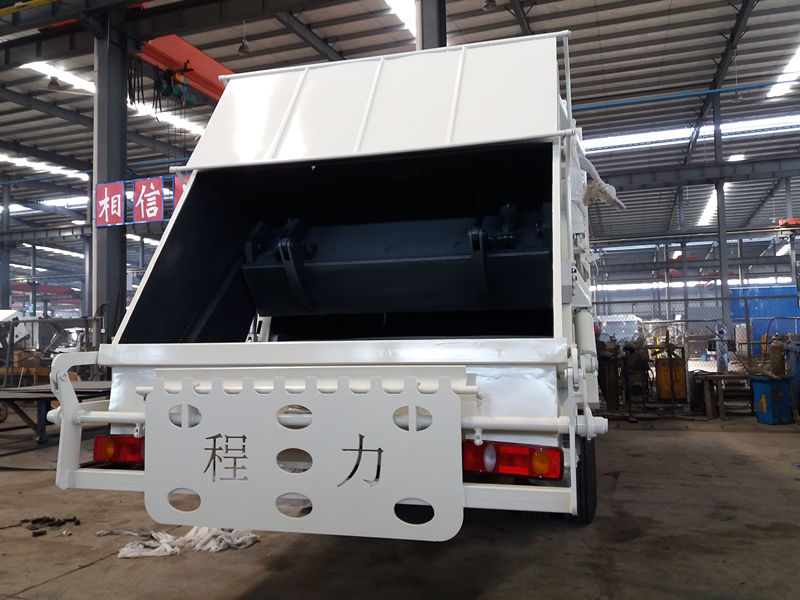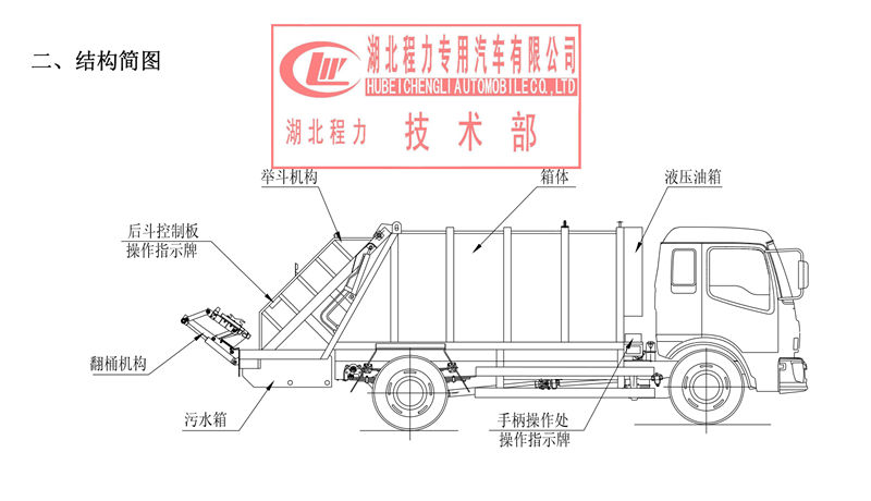 專用部分由取力器,液壓泵,氣動手動一體化多路換向閥, 5聯集成氣閥,油缸,垃圾廂、填裝器、刮板、污水箱、推鏟等組成。